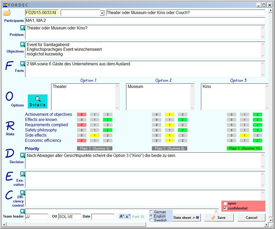 Die Software SOL-VE FORDEC unterstützt sowohl bei der Durchführung einer Entscheidungsfindung im Team nach der Methode FORDEC als auch bei der Verwaltung und Auswertung mit verschiedenen Handlungsoptionen.